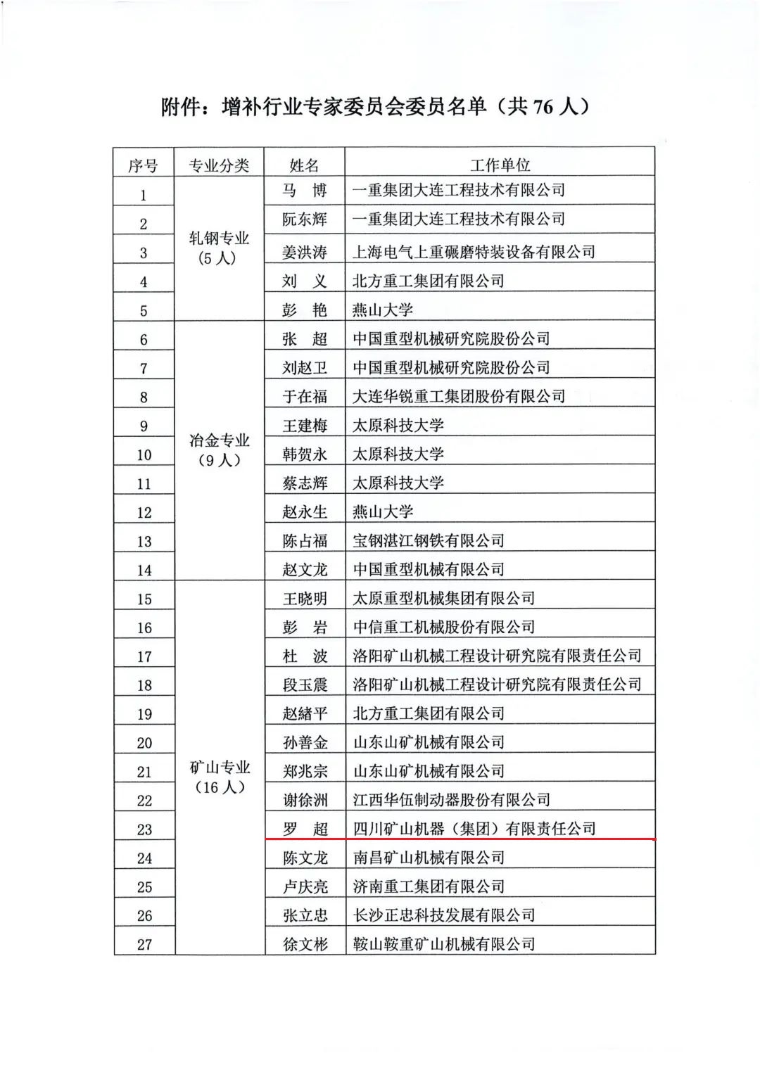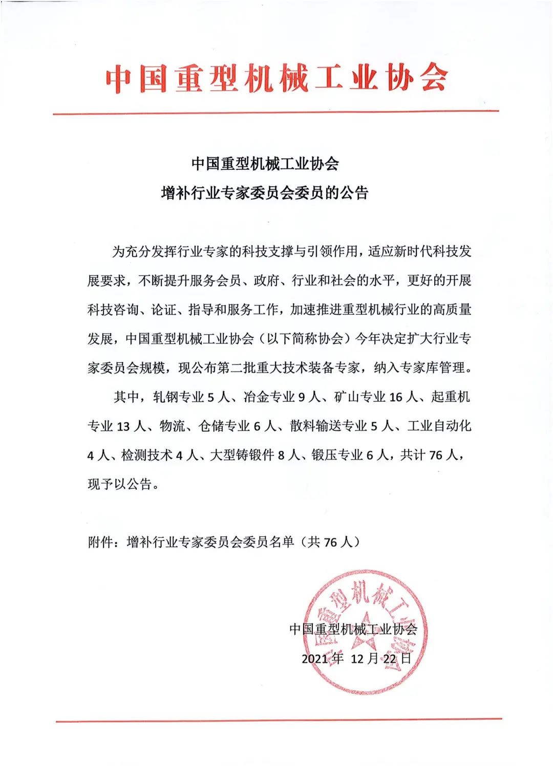 中國重型機械工業協會增補行業專家委員會委員的公告