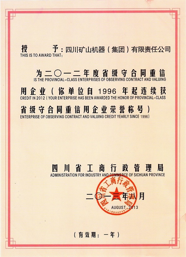 川礦集團公司日前,從省工商局獲悉,四川礦山機器(集團)有限責任公司喜獲“省級守合同重信用企業”稱號(公司自1996年起連續獲省級守合同重信用企業榮譽稱號),并頒發了榮譽證書。