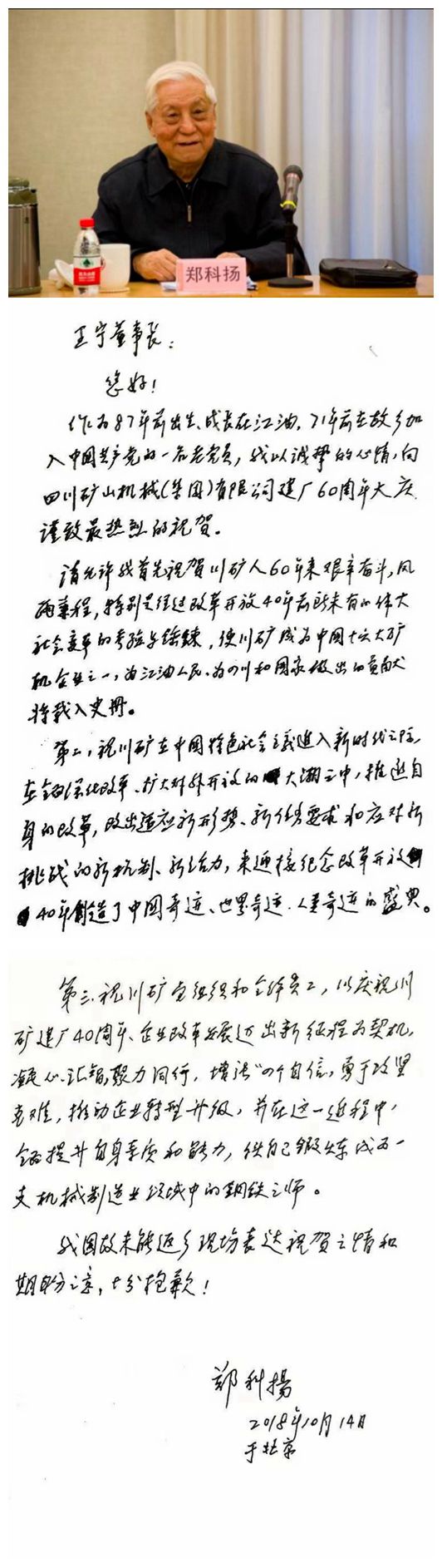 原中組部副秘書(shū)長(zhǎng)、中央政策研究室副主任鄭科揚(yáng)專(zhuān)門(mén)為川礦集團(tuán)六十周年華誕發(fā)來(lái)的賀信